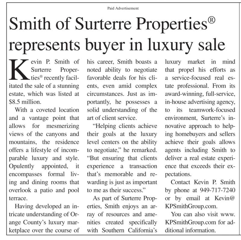 Contact Kevin P. Smith by phone at 949-717-7240 or by email at Kevin@ KPSmithGroup.com.