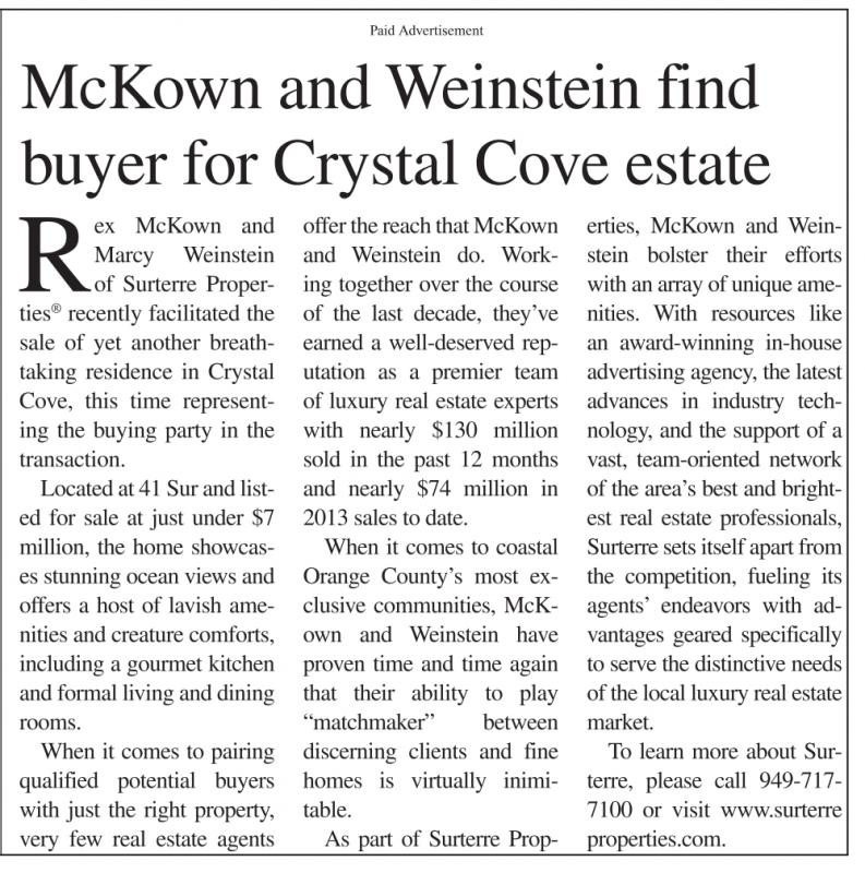 McKown and Marcy Weinstein of Surterre Properties ® recently facilitated the sale of yet another breathtaking residence in Crystal Cove, this time representing the buying party in the transaction.