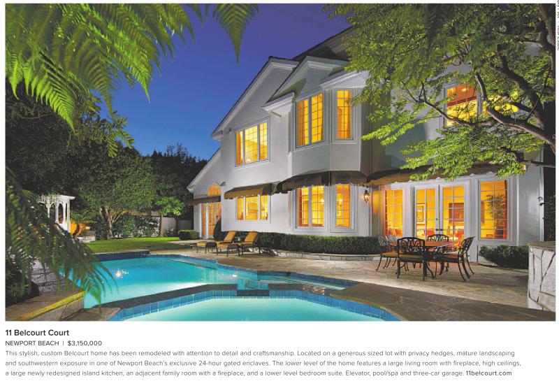 11 Belcourt Court NEWPORT BEACH | $3,150,000 This stylish, custom Belcourt home has been remodeled with attention to detail and craftsmanship. Located on a generous sized lot with privacy hedges, mature landscaping and southwestern exposure in one of Newport Beach’s exclusive 24-hour gated enclaves. The lower level of the home features a large living room with fireplace, high ceilings, a large newly redesigned island kitchen, an adjacent family room with a fireplace, and a lower level bedroom suite. Elevator, pool/spa and three-car garage. 11belcourt.com