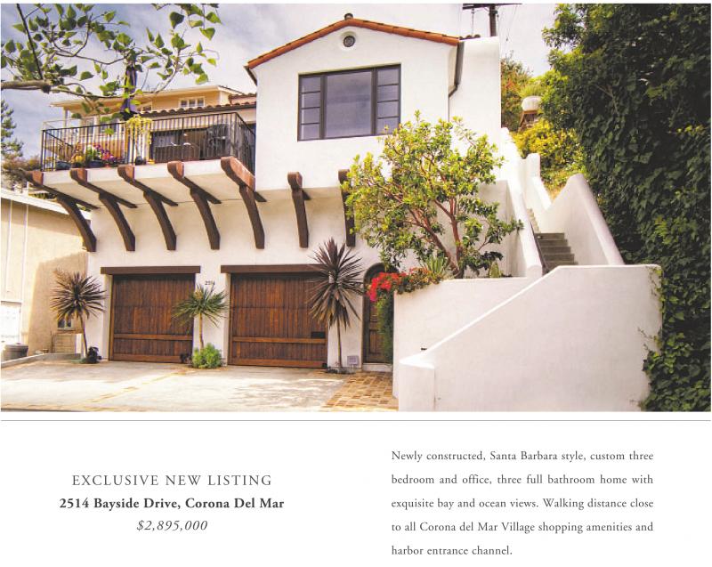 Newly constructed, Santa Barbara style, custom three EXCLUSIVE NEW LISTING 2514 Bayside Drive, Corona Del Mar $2,895,000 bedroom and office, three full bathroom home with exquisite bay and ocean views. Walking distance close to all Corona del Mar Village shopping amenities and harbor entrance channel.