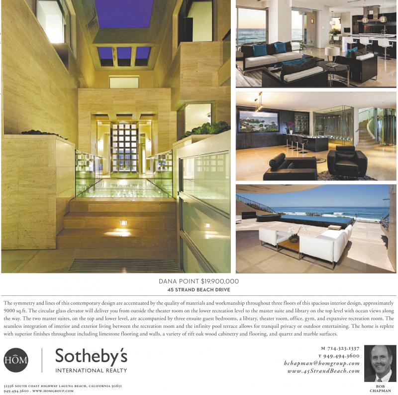 DANA POINT $19,900,000 45 STRAND BEACH DRIVE Thesymmetryand lines of this contemporary design areaccentuatedbythe qualityofmaterials andworkmanship throughout threefloorsofthisspaciousinteriordesign, approximately 9000 sq.ft. The circular glass elevator will deliver you from outside the theater room on the lower recreation level to the master suite and library on the top level with ocean views along the way. The two master suites, on the top and lower level, are accompanied by three ensuite guest bedrooms, a library, theater room, office, gym, and expansive recreation room. The seamless integration of interior and exterior living between the recreation room and the infinity pool terrace allows for tranquil privacy or outdoor entertaining. The home is replete with superior finishes throughout including limestone flooring and walls, a variety of rift oak wood cabinetry and flooring, and quartz and marble surfaces. m 714.323.1337 t 949.494.3600 bchapman@homgroup.com www.45StrandBeach.com 32356 south coast highway laguna beach, california 92651 949.494.3600 . www.homgroup.com bob chapman