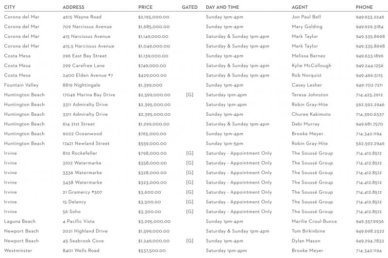 Corona del Mar 4615 Wayne Road $2,195,000.00 Sunday 1pm-4pm Jon Paul Bell 949.933.2246 Corona del Mar 709 Narcissus Avenue $1,685,000.00 Sunday 1pm-4pm Mary Golding 949.929.3184 Corona del Mar 415 Narcissus Avenue $1,149,000.00 Saturday & Sunday 1pm-4pm Mark Taylor 949.335.8698 Corona del Mar 415.5 Narcissus Avenue $1,049,000.00 Saturday & Sunday 1pm-4pm Mark Taylor 949.335.8698 Costa Mesa 296 East Bay Street $1,139,000.00 Sunday 1pm-4pm Melissa Barnes 949.633.1896 Costa Mesa 299 Carefree Lane $749,000.00 Saturday & Sunday 1pm-4pm Kylie McCollough 949.244.1256 Costa Mesa 2400 Elden Avenue #7 $429,000.00 Saturday & Sunday 1pm-4pm Rob Norquist 949.466.5115 Fountain Valley 8819 Nightingale $1,399,000 Sunday 1pm-4pm Casey Lesher 949-702-7211 Huntington Beach 17046 Marina Bay Drive $2,599,000.00 [G] Saturday 1pm-4pm Teresa Johnston 714.425.2912 Huntington Beach 3311 Admiralty Drive $2,395,000.00 Saturday 1pm-4pm Robin Gray-Hite 562.592.2946 Huntington Beach 3311 Admiralty Drive $2,395,000.00 Sunday 1pm-4pm Churee Kakimoto 714.390.6337 Huntington Beach 614 21st Street $1,299,000.00 Saturday & Sunday 1pm-4pm Debi Murray 949.981.7570 Huntington Beach 9022 Oceanwood $765,000.00 Sunday 1pm-4pm Brooke Meyer 714.342.1194 Huntington Beach 17421 Newland Street $559,000.00 Sunday 1pm-5pm Robin Gray-Hite 562.592.2946 Irvine 810 Rockefeller $798,000.00 [G] Saturday - Appointment Only The Soussé Group 714.412.8512 Irvine 3102 Watermarke $358,000.00 [G] Saturday - Appointment Only The Soussé Group 714.412.8512 Irvine 3336 Watermarke $328,000.00 [G] Saturday - Appointment Only The Soussé Group 714.412.8512 Irvine 3438 Watermarke $323,000.00 [G] Saturday - Appointment Only The Soussé Group 714.412.8512 Irvine 21 Gramercy #307 $3,600.00 [G] Saturday - Appointment Only The Soussé Group 714.412.8512 Irvine 15 Delancy $3,500.00 [G] Saturday - Appointment Only The Soussé Group 714.412.8512 Irvine 56 Soho $3,300.00 [G] Saturday - Appointment Only The Soussé Group 714.412.8512 Laguna Beach 4 Pacific Vista $3,295,000.00 Sunday 1pm-4pm Marilie Croul-Bunce 949.357.9936 Newport Beach 2021 Highland Drive $1,599,000.00 Saturday & Sunday 1pm-4pm Tom Birkinbine 949.698.2522 Newport Beach 45 Seabrook Cove $1,249,000.00 [G] Sunday 1pm-4pm Dylan Mason 949.294.7832 Westminster 8401 Wells Road $537,500.00 Saturday 1pm-4pm Brooke Meyer 714.342.1194