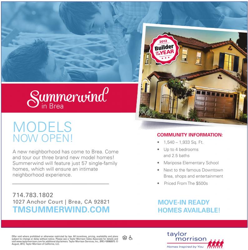 in Brea MODELS NOW OPEN! A new neighborhood has come to Brea. Come and tour our three brand new model homes! Summerwind will feature just 57 single-family homes, which will ensure an intimate neighborhood experience. 714.783.1802 1027 Anchor Court | Brea, CA 92821 TMSUMMERWIND.COM COMMUNITY INFORMATION: • 1,540 – 1,933 Sq. Ft. • Up to 4 bedrooms and 2.5 baths • Mariposa Elementary School • Next to the famous Downtown Brea, shops and entertainment • Priced From The $500s MOVE-IN READY HOMES AVAILABLE! Offer void where prohibited or otherwise restricted by law. All incentives, pricing, availability and plans subject to change or delay without notice. Please see aTaylor Morrison Sales Associate for details and visit www.taylormorrison.com for additional disclaimers. Taylor Morrison Services, Inc., BRE #00968975. © August, 2013, Taylor Morrison of California, LLC.