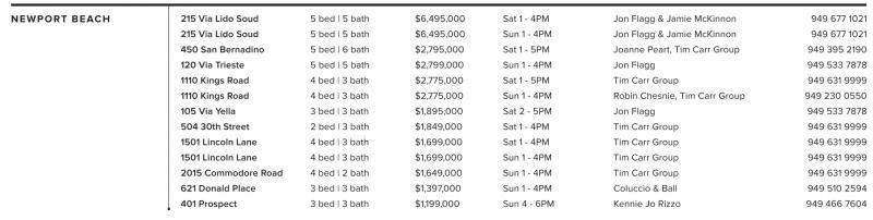 NEWPORT BEACH 215 Via Lido Soud 5 bed | 5 bath $6,495,000 Sat 1 - 4PM Jon Flagg & Jamie McKinnon 949 677 1021 215 Via Lido Soud 5 bed | 5 bath $6,495,000 Sun 1 - 4PM Jon Flagg & Jamie McKinnon 949 677 1021 450 San Bernadino 5 bed | 6 bath $2,795,000 Sat 1 - 5PM Joanne Peart, Tim Carr Group 949 395 2190 120 Via Trieste 5 bed | 5 bath $2,799,000 Sun 1 - 4PM Jon Flagg 949 533 7878 1110 Kings Road 4 bed | 3 bath $2,775,000 Sat 1 - 5PM Tim Carr Group 949 631 9999 1110 Kings Road 4 bed | 3 bath $2,775,000 Sun 1 - 4PM Robin Chesnie, Tim Carr Group 949 230 0550 105 Via Yella 3 bed | 3 bath $1,895,000 Sat 2 - 5PM Jon Flagg 949 533 7878 504 30th Street 2 bed | 3 bath $1,849,000 Sat 1 - 4PM Tim Carr Group 949 631 9999 1501 Lincoln Lane 4 bed | 3 bath $1,699,000 Sat 1 - 4PM Tim Carr Group 949 631 9999 1501 Lincoln Lane 4 bed | 3 bath $1,699,000 Sun 1 - 4PM Tim Carr Group 949 631 9999 2015 Commodore Road 4 bed | 2 bath $1,649,000 Sun 1 - 4PM Tim Carr Group 949 631 9999 621 Donald Place 3 bed | 3 bath $1,397,000 Sun 1 - 4PM Coluccio & Ball 949 510 2594 401 Prospect 3 bed | 3 bath $1,199,000 Sun 4 - 6PM Kennie Jo Rizzo 949 466 7604