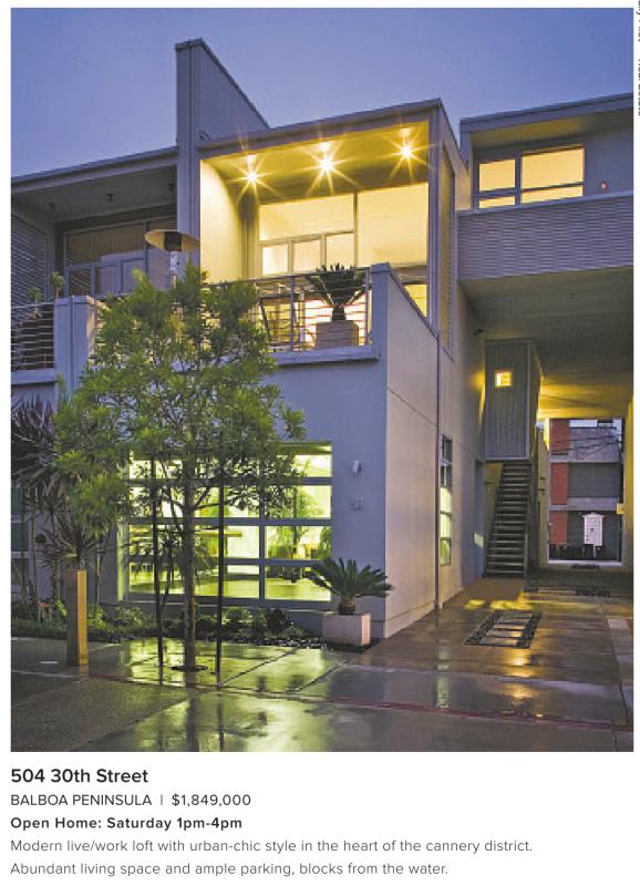 BALBOA PENINSULA | $1,849,000 Open Home: Saturday 1pm-4pm Modern live/work loft with urban-chic style in the heart of the cannery district. Abundant living space and ample parking, blocks from the water.