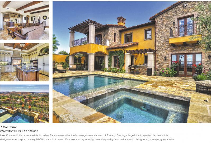 7 Columnar COVENANT HILLS | $2,900,000 Luxe Covenant Hills custom estate in Ladera Ranch evokes the timeless elegance and charm of Tuscany. Gracing a large lot with spectacular views, this designer-perfect, approximately 6,000 square foot home offers every luxury amenity, resort-inspired grounds with alfresco living room, pool/spa, guest casita.