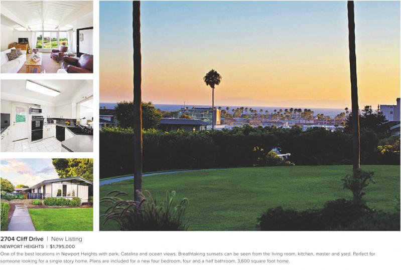 2704 Cliff Drive | New Listing NEWPORT HEIGHTS | $1,795,000 One of the best locations in Newport Heights with park, Catalina and ocean views. Breathtaking sunsets can be seen from the living room, kitchen, master and yard. Perfect for someone looking for a single story home. Plans are included for a new four bedroom, four and a half bathroom, 3,600 square foot home. See also