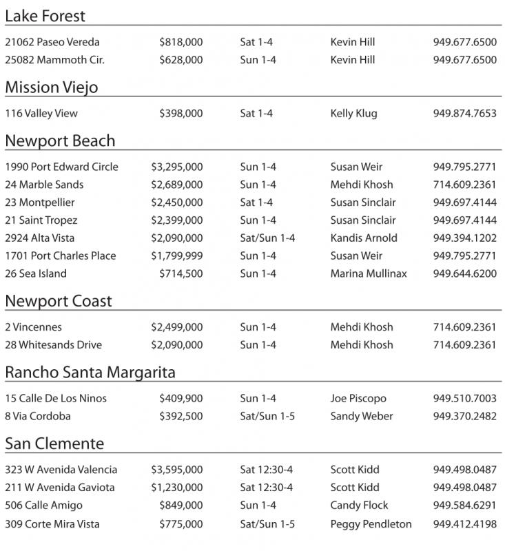 1990 Port EdwardCircle $3,295,000 Sun 1-4 Susan Weir 949.795.2771 24 Marble Sands $2,689,000 Sun 1-4 Mehdi Khosh 714.609.2361 23 Montpellier $2,450,000 Sat 1-4 Susan Sinclair 949.697.4144 21 Saint Tropez $2,399,000 Sun 1-4 Susan Sinclair 949.697.4144 2924 Alta Vista $2,090,000 Sat/Sun 1-4 Kandis Arnold 949.394.1202 1701 Port Charles Place $1,799,999 Sun 1-4 Susan Weir 949.795.2771 26 SeaIsland $714,500 Sun 1-4 Marina Mullinax 949.644.6200