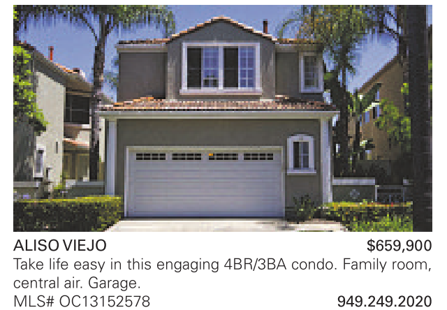 ALISO VIEJO $659,900 Take life easy in this engaging 4BR/3BA condo. Family room, central air. Garage. MLS# OC13152578 949.249.2020