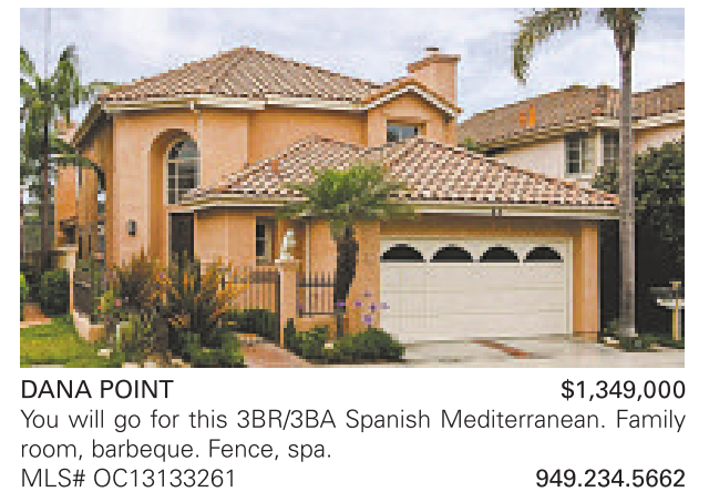 DANA POINT $1,349,000 You will go for this 3BR/3BA Spanish Mediterranean. Family room, barbeque. Fence, spa. MLS# OC13133261 949.234.5662