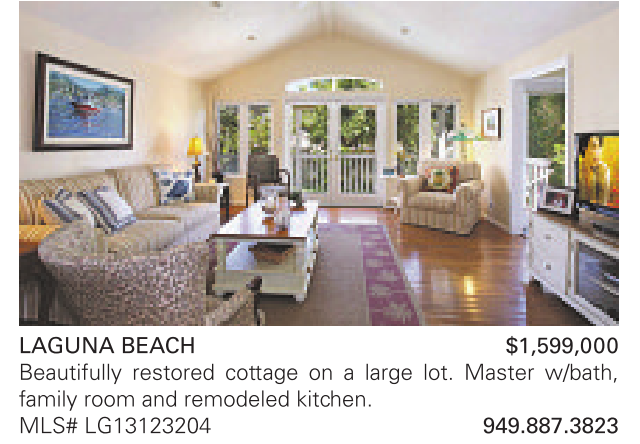 LAGUNA BEACH $1,599,000 Beautifully restored cottage on a large lot. Master w/bath, family room and remodeled kitchen. MLS# LG13123204 949.887.3823