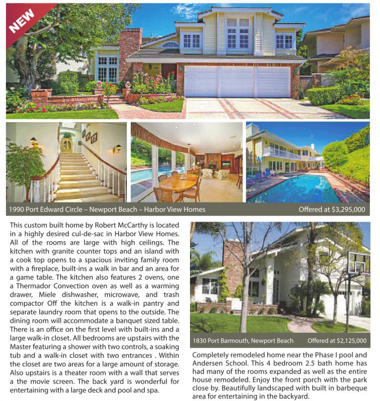 1990 Port EdwardCircle –NewportBeach –Harbor View Homes Offered at $3,295,000 This custom built home by Robert McCarthy is located in a highly desired cul-de-sac in Harbor View Homes. All of the rooms are large with high ceilings. The kitchen with granite counter tops and an island with a cook top opens to a spacious inviting family room with a fireplace, built-ins a walk in bar and an area for a game table. The kitchen also features 2 ovens, one a Thermador Convection oven as well as a warming drawer, Miele dishwasher, microwave, and trash compactor Off the kitchen is a walk-in pantry and separate laundry room that opens to the outside. The dining room will accommodate a banquet sized table. There is an office on the first level with built-ins and a large walk-in closet. All bedrooms are upstairs with the Master featuring ashowerwith twocontrols,asoaking tub and a walk-in closet with two entrances . Within the closet are two areas for a large amount of storage. Also upstairs is a theater room with a wall that serves a the movie screen. The back yard is wonderful for entertaining with alarge deck and pool and spa. 1830 Port Barmouth, NewportBeach Offered at $2,125,000 Completely remodeled home near the Phase I pool and Andersen School. This 4 bedroom 2.5 bath home has had many of the rooms expanded as well as the entire house remodeled. Enjoy the front porch with the park close by. Beautifully landscaped with built in barbeque area for entertaining in the backyard.