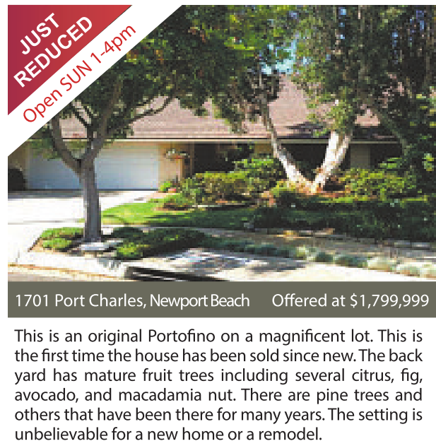 1701 Port Charles,NewportBeach Offered at $1,799,999 This is an original Portofino on a magnificent lot. This is the first time the house has been sold sincenew.The back yard has mature fruit trees including several citrus, fig, avocado, and macadamia nut. There are pine trees and others that have been therefor manyyears.The setting is unbelievable foranew home or aremodel.