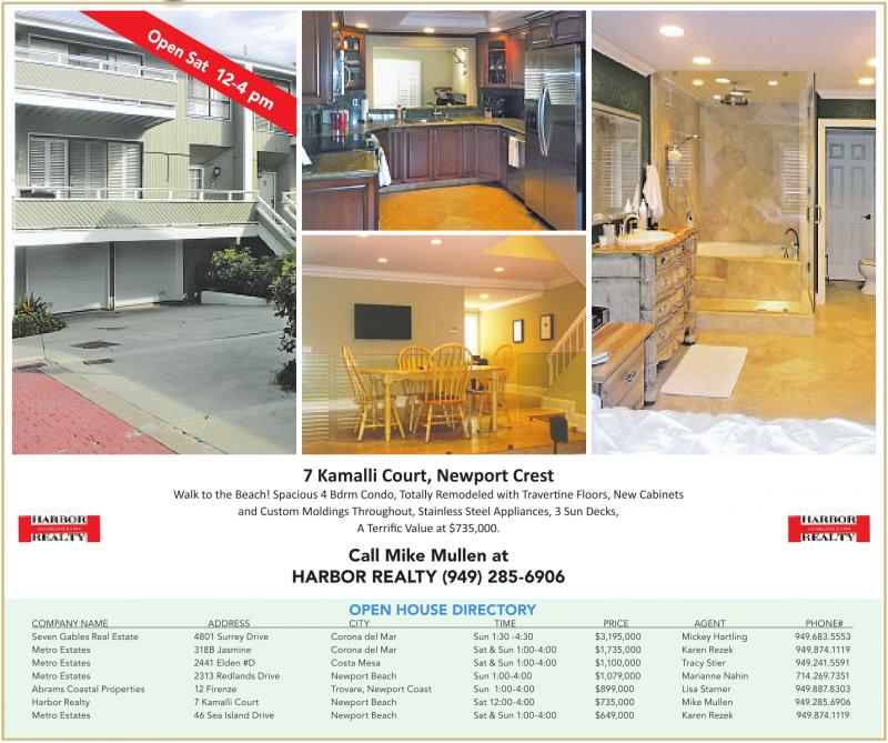 OPEN HOUSE DIRECTORY COMPANY NAME ADDRESS CITY TIME PRICE AGENT PHONE# Seven Gables Real Estate 4801 Surrey Drive Corona del Mar Sun 1:30 -4:30 $3,195,000 Mickey Hartling 949.683.5553 Metro Estates 318B Jasmine Corona del Mar Sat &Sun 1:00-4:00 $1,735,000 Karen Rezek 949.874.1119 Metro Estates 2441 Elden #D Costa Mesa Sat &Sun 1:00-4:00 $1,100,000 Tracy Stier 949.241.5591 Metro Estates 2313 Redlands Drive Newport Beach Sun 1:00-4:00 $1,079,000 Marianne Nahin 714.269.7351 Abrams Coastal Properties 12Firenze Trovare, Newport Coast Sun 1:00-4:00 $899,000 Lisa Starner 949.887.8303 Harbor Realty 7Kamalli Court Newport Beach Sat 12:00-4:00 $735,000 Mike Mullen 949.285.6906 Metro Estates 46Sea Island Drive Newport Beach Sat &Sun 1:00-4:00 $649,000 Karen Rezek 949.874.1119
