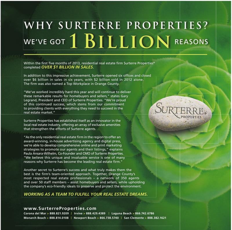 In addition to this impressive achievement, Surterre opened six offices and closed over $6 billion in sales in six years, with $2 billion sold in 2012 alone. The firm was also named a Top Workplace in Orange County.