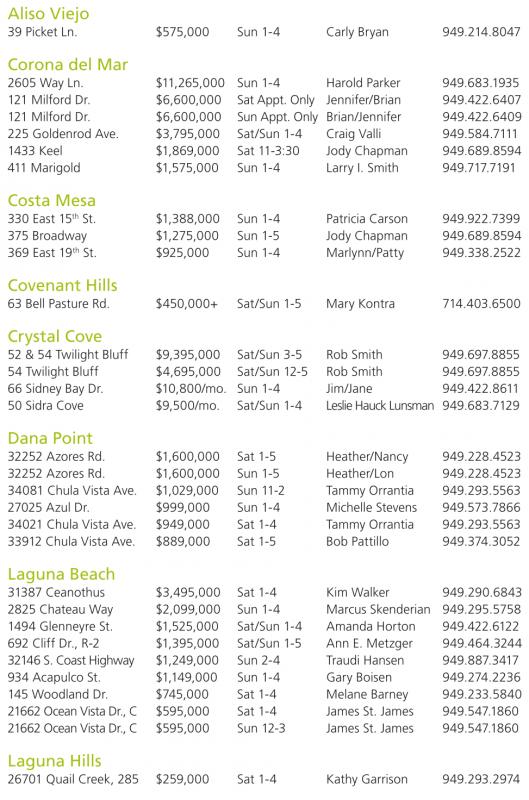 31387 Ceanothus $3,495,000 Sat 1-4 Kim Walker 949.290.6843 2825 Chateau Way $2,099,000 Sun 1-4 Marcus Skenderian 949.295.5758 1494 Glenneyre St. $1,525,000 Sat/Sun 1-4 Amanda Horton 949.422.6122 692 Cliff Dr., R-2 $1,395,000 Sat/Sun 1-5 Ann E. Metzger 949.464.3244 32146S.Coast Highway $1,249,000 Sun 2-4 Traudi Hansen 949.887.3417 934 Acapulco St. $1,149,000 Sun 1-4 Gary Boisen 949.274.2236 145 Woodland Dr. $745,000 Sat 1-4 Melane Barney 949.233.5840 21662Ocean Vista Dr., C $595,000 Sat 1-4 James St. James 949.547.1860 21662Ocean Vista Dr., C $595,000 Sun 12-3 James St. James 949.547.1860