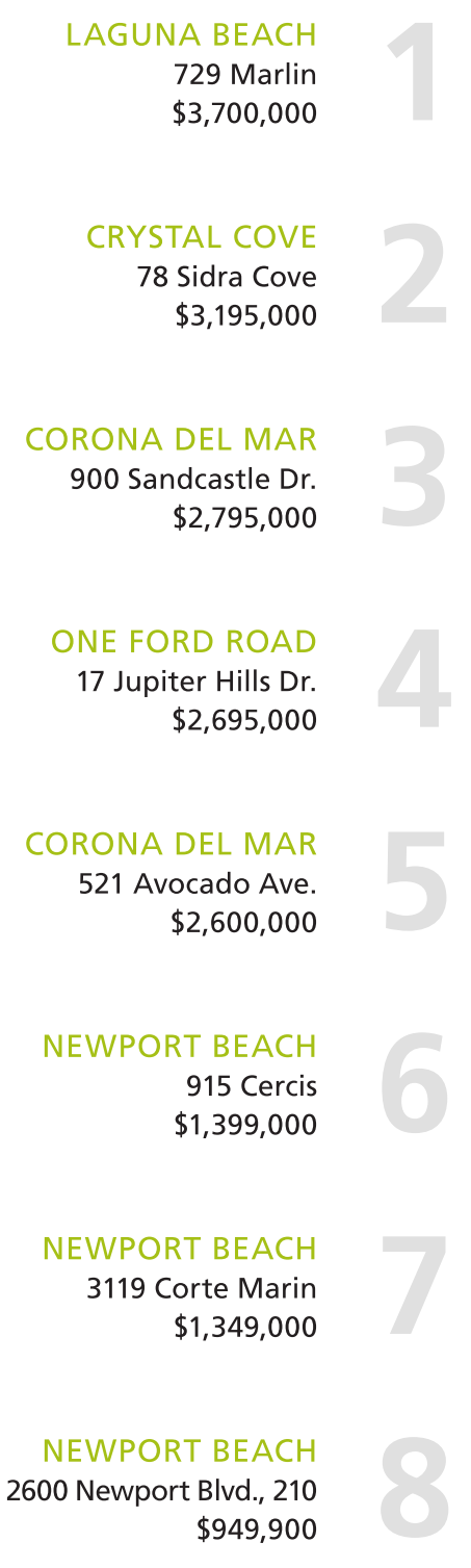 LAGUNA BEACH 729 Marlin $3,700,000 CRYSTAL COVE 78 Sidra Cove $3,195,000 1 2 CORONA DEL MAR 900 Sandcastle Dr. $2,795,000 3 ONE FORD ROAD 17 Jupiter Hills Dr. $2,695,000 4 CORONA DEL MAR 521 Avocado Ave. $2,600,000 5 NEWPORT BEACH 915 Cercis $1,399,000 6 NEWPORT BEACH 3119 Corte Marin $1,349,000 7 NEWPORT BEACH 2600 Newport Blvd., 210 $949,900 8