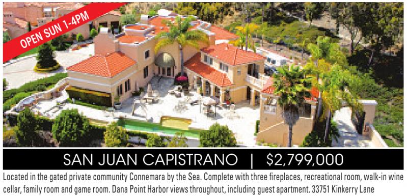 SAN JUAN CAPISTRANO | $2,799,000 Locatedinthe gatedprivate community Connemarabythe Sea. Complete with threefireplaces,recreational room,walk-in wine cellar,familyroom andgameroom.DanaPointHarborviews throughout, includingguest apartment. 33751Kinkerry Lane