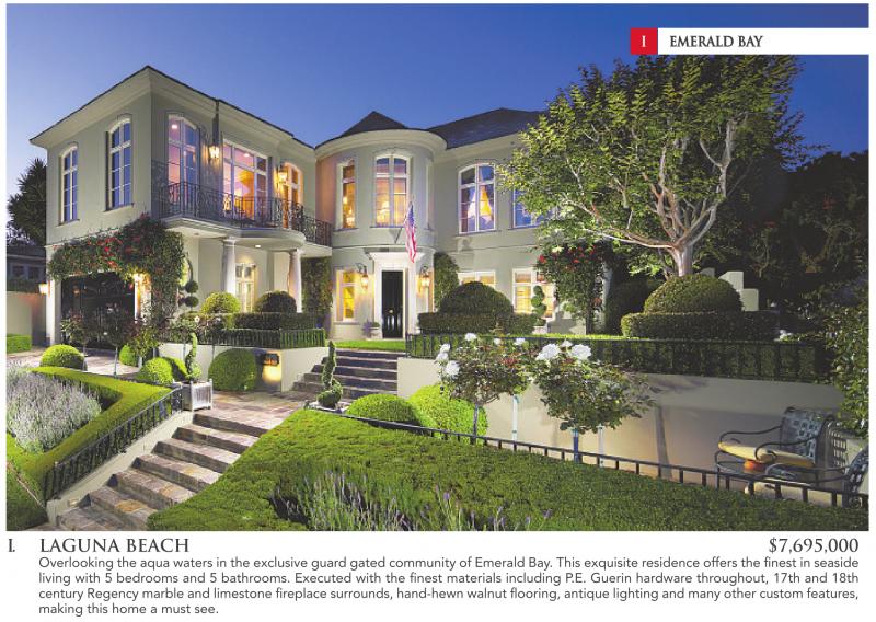 IEMERALD BAY EMERALD BAY I. LAGUNA BEACH $7,695,000 Overlooking the aqua waters in the exclusive guard gated community of Emerald Bay. This exquisite residence offers the finest in seaside living with 5 bedrooms and 5 bathrooms. Executed with the finest materials including P.E. Guerin hardware throughout, 17th and 18th century Regency marble and limestone fireplace surrounds, hand-hewn walnut flooring, antique lighting and many other custom features, making this home a must see.