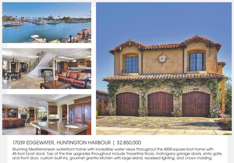 17039 EDGEWATER, HUNTINGTON HARBOUR | $2,850,000 Stunning Mediterranean waterfront home with incredible water views throughout this 4000-square-foot home with 45-foot boat dock. Top of the line upgrades throughout include Travertine floors, mahogany garage doors, entry gate, and front door, custom built-ins, gourmet granite kitchen with large island, recessed lighting, and crown molding.