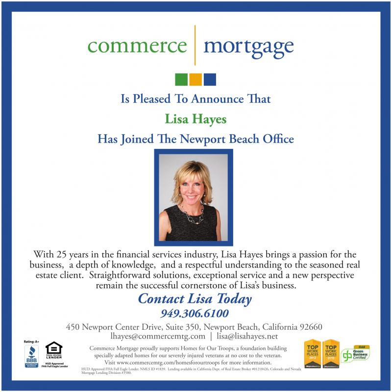 Is Pleased To Announce That Lisa Hayes Has Joined The Newport Beach Office With 25 years in the financial services industry, Lisa Hayes brings a passion for the business, a depth of knowledge, and a respectful understanding to the seasoned real estate client. Straightforward solutions, exceptional service and a new perspective remain the successful cornerstone of Lisa’s business. Contact Lisa Today 949.306.6100 450 Newport Center Drive, Suite 350, Newport Beach, California 92660 lhayes@commercemtg.com | lisa@lisahayes.net Commerce Mortgage proudly supports Homes for Our Troops, a foundation building specially adapted homes for our severely injured veterans at no cost to the veteran. Visit www.commercemtg.com/homesforourtroops for more information. HUD Approved FHA Full Eagle Lender.NMLS ID #1839. Lending available in California Dept. of Real Estate Broker #01218426, Colorado and Nevada Mortgage Lending Division #3580.