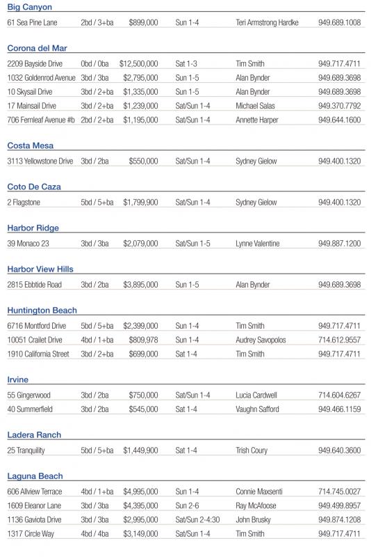 Corona del Mar 2209 Bayside Drive 0bd /0ba $12,500,000 Sat 1-3 TimSmith 949.717.4711 1032 Goldenrod Avenue 3bd /3ba $2,795,000 Sun 1-5 Alan Bynder 949.689.3698 10 Skysail Drive 3bd /2+ba $1,335,000 Sun 1-5 Alan Bynder 949.689.3698 17 Mainsail Drive 3bd /2+ba $1,239,000 Sat/Sun 1-4 Michael Salas 949.370.7792 706 Fernleaf Avenue #b 2bd /2+ba $1,195,000 Sat/Sun 1-4 Annette Harper 949.644.1600 Costa Mesa 3113 Yellowstone Drive 3bd /2ba $550,000 Sat/Sun 1-4 Sydney Gielow 949.400.1320 Coto De Caza 2Flagstone 5bd /5+ba $1,799,900 Sat/Sun 1-4 Sydney Gielow 949.400.1320 Harbor Ridge 39 Monaco 23 3bd /3ba $2,079,000 Sat/Sun 1-5 Lynne Valentine 949.887.1200 Harbor View Hills 2815 Ebbtide Road 3bd /2ba $3,895,000 Sun 1-5 Alan Bynder 949.689.3698 Huntington Beach 6716 Montford Drive 5bd /5+ba $2,399,000 Sun 1-4 TimSmith 949.717.4711 10051 Crailet Drive 4bd /1+ba $809,978 Sun 1-4 Audrey Savopolos 714.612.9557 1910 California Street 3bd /2+ba $699,000 Sat 1-4 TimSmith 949.717.4711