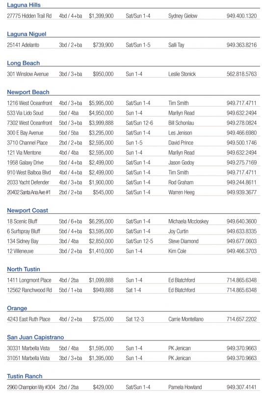 Laguna Niguel 25141 Adelanto 3bd /2+ba $739,900 Sat/Sun 1-5 Salli Tay 949.363.8216 Long Beach 301 Winslow Avenue 3bd /3+ba $950,000 Sun 1-4 Leslie Stonick 562.818.5763 Newport Beach 1216 West Oceanfront 4bd /3+ba $5,995,000 Sat/Sun 1-4 TimSmith 949.717.4711 533 Via Lido Soud 5bd /4ba $4,950,000 Sun 1-4 Marilyn Read 949.632.2494 7302 West Oceanfront 5bd /3+ba $3,999,888 Sat/Sun 12-6 Bill Schonlau 949.278.0824 300 EBay Avenue 5bd /5ba $3,295,000 Sat/Sun 1-4 Les Jenison 949.466.6980 3710 Channel Place 2bd /2+ba $2,595,000 Sun 1-5 David Prince 949.500.1746 121 Via Mentone 4bd /4ba $2,595,000 Sun 1-4 Marilyn Read 949.632.2494 1958 Galaxy Drive 5bd /4+ba $2,499,000 Sat/Sun 1-4 Jason Godoy 949.275.7169 910 West Balboa Blvd 4bd /4+ba $2,499,000 Sat/Sun 1-4 TimSmith 949.717.4711 2033 Yacht Defender 4bd /3+ba $1,900,000 Sat/Sun 1-4 Rod Graham 949.244.8611 20402 SantaAnaAve#1 2bd /2+ba $545,000 Sat/Sun 1-4 Warren Heeg 949.939.3677 Newport Coast 18 Scenic Bluff 5bd /6+ba $6,295,000 Sat/Sun 1-4 Michaela Mccloskey 949.640.3600 6Surfspray Bluff 5bd /4+ba $3,595,000 Sat/Sun 1-4 Joy Curtin 949.633.8335 134 Sidney Bay 3bd /4ba $2,850,000 Sat/Sun 12-5 Steve Diamond 949.677.0603 12 Villeneuve 3bd /2+ba $1,410,000 Sun 1-4 Kim Cole 949.466.3703
