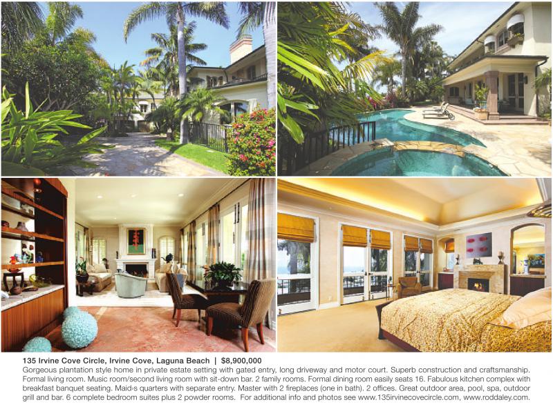 135 Irvine Cove Circle, Irvine Cove, Laguna Beach | $8,900,000 Gorgeous plantation style home in private estate setting with gated entry, long driveway and motor court. Superb construction and craftsmanship. Formal living room. Music room/second living room with sit-down bar. 2 family rooms. Formal dining room easily seats 16. Fabulous kitchen complex with breakfast banquet seating. Maid›s quarters with separate entry. Master with 2 fireplaces (one in bath). 2 offices. Great outdoor area, pool, spa, outdoor grill and bar. 6 complete bedroom suites plus 2 powder rooms. For additional info and photos see www.135irvinecovecircle.com, www.roddaley.com. See also