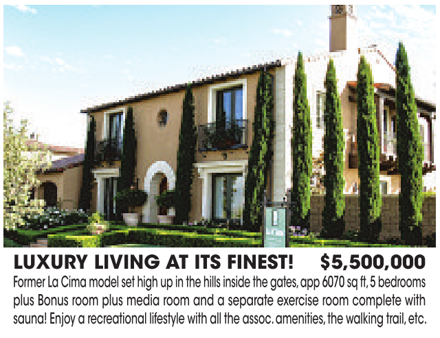 LUXURY LIVING AT ITS FINEST! $5,500,000 Former La Cima model set high up in the hills inside the gates,app 6070 sq ft, 5bedrooms plus Bonus room plus media room and aseparate exercise room complete with sauna! Enjoy arecreational lifestyle with all the assoc. amenities,the walking trail, etc.