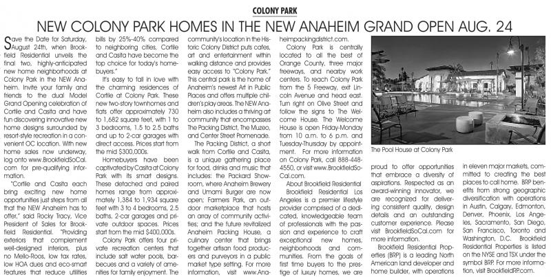 the Date for Saturday, August 24th, when Brookfield Residential unveils the final two, highly-anticipated new home neighborhoods at Colony Park in the NEW Anaheim. Invite your family and friends to the dual Model Grand Opening celebration of Cortile and Casita and have fun discovering innovative new home designs surrounded by resort-style recreation in aconvenient OC location. With new home sales now underway, log onto www.BrookfieldSoCal. com for pre-qualifying information.
