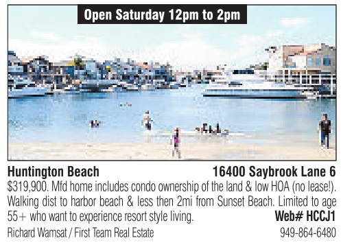 Open Saturday 12pm to 2pm Huntington Beach 16400 Saybrook Lane 6 $319,900. Mfd home includes condo ownership of the land &low HOA (no lease!). Walking dist to harbor beach &less then 2mi from Sunset Beach. Limited to age 55+ who want to experience resortstyle living. Web# HCCJ1 RichardWamsat /First Team Real Estate 949-864-6480