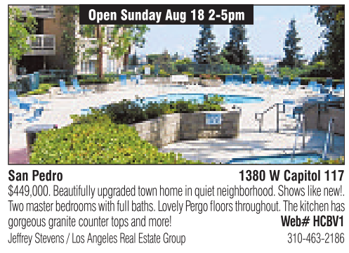 Open Sunday Aug 18 2-5pm San Pedro 1380 WCapitol 117 $449,000. Beautifully upgraded town home in quiet neighborhood. Shows like new!. Twomaster bedrooms with full baths. Lovely Pergofloors throughout. The kitchen has gorgeous granite counter tops and more! Web# HCBV1 Jeffrey Stevens /Los Angeles Real Estate Group 310-463-2186