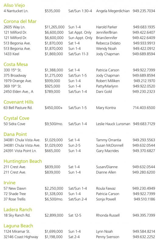Aliso Viejo 4 Nantucket Ln. $535,000 Sat/Sun 1:30-4 Angela Megerdichian 949.235.7034 Corona del Mar 2605 Way Ln. $11,265,000 Sun 1-4 Harold Parker 949.683.1935 121 Milford Dr. $6,600,000 Sat Appt. Only Jennifer/Brian 949.422.6407 121 Milford Dr. $6,600,000 Sun Appt. Only Brian/Jennifer 949.422.6409 513 Begonia Ave. $1,870,000 Sat 1-4 Rebecca Didato 949.933.9913 513 Begonia Ave. $1,870,000 Sun 1-4 Wendy Noah 949.422.0912 1433 Keel $1,869,000 Sat/Sun 11-3 Jody Chapman 949.689.8594 Costa Mesa 330 15 th St. $1,388,000 Sat 1-4 Patricia Carson 949.922.7399 375 Broadway $1,275,000 Sat/Sun 1-5 Jody Chapman 949.689.8594 1979 Orange Ave. $939,000 Sun 1-4 Robert Milliken 949.212.1970 369 19 th St. $925,000 Sun 1-4 Patty/Marlynn 949.922.0520 2450 Elden Ave., A $789,000 Sat/Sun 1-4 Dani Gold 949.230.2323 Covenant Hills 63 Bell Pasture Rd. $450,000+ Sat/Sun 1-5 Mary Kontra 714.403.6500 Crystal Cove 50 Sidra Cove $9,500/mo. Sat/Sun 1-4 Leslie Hauck Lunsman 949.683.7129 Dana Point 34081 Chula Vista Ave. $1,029,000 Sat 1-4 Tammy Orrantia 949.293.5563 34081 Chula Vista Ave. $1,029,000 Sun 2-5 Susan McDonnell 949.632.0544 24391 Vista Point Ln. $665,000 Sun 1-4 Gary Macrides 949.370.6827 Huntington Beach 211 Crest Ave. $839,000 Sat 1-4 Susan/Dianne 949.632.0544 211 Crest Ave. $839,000 Sun 1-4 Dianne Allen 949.280.6200 Irvine 57 New Dawn $2,250,000 Sat/Sun 1-4 Roula Fawaz 949.230.4949 72 Shade Tree $1,328,000 Sun 1-4 Patricia Carson 949.922.7399 37 Rose Trellis $6,500/mo. Sat/Sun 2-4 Sonja Powell 949.510.1186 Ladera Ranch 18 Sky Ranch Rd. $2,899,000 Sat 12-5 Rhonda Russell 949.395.7399 Laguna Beach 1124 Miramar St. $1,699,000 Sun 1-4 Lynn Noah 949.584.8214 32146 Coast Highway $1,198,000 Sat 2-4 Penny Svenson 949.632.2252