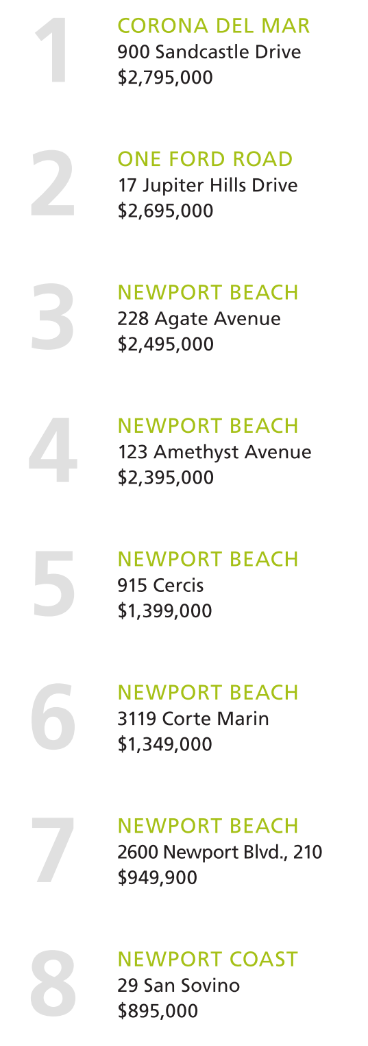 1 CORONA DEL MAR 900 Sandcastle Drive $2,795,000 2 3 4 5 6 7 ONE FORD ROAD 17 Jupiter Hills Drive $2,695,000 NEWPORT BEACH 228 Agate Avenue $2,495,000 NEWPORT BEACH 123 Amethyst Avenue $2,395,000 NEWPORT BEACH 915 Cercis $1,399,000 NEWPORT BEACH 3119 Corte Marin $1,349,000 NEWPORT BEACH 2600 Newport Blvd., 210 $949,900 8 NEWPORT COAST 29 San Sovino $895,000