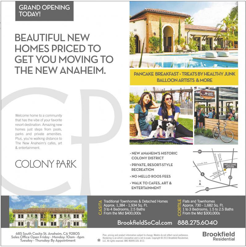 GRAND OPENING TODAY! BEAUTIFUL NEW HOMES PRICED TO GET YOU MOVING TO THE NEW ANAHEIM. PANCAKE BREAKFAST• TREATSBYHEALTHYJUNK BALLOONARTISTS &MORE Welcome home to a community that has the vibe of your favorite resort destination. Amazing new homes just steps from pools, parks and private amenities. Plus, you’re walking distance to The New Anaheim’s cafes, art & entertainment. • NEW ANAHEIM’S HISTORIC COLONY DISTRICT • PRIVATE, RESORT-STYLE RECREATION • NO MELLO ROOS FEES • WALK TO CAFES, ART & ENTERTAINMENT 91 5 NMAP NOT TO SCALE 22 WELCOME HOUSE 57 Traditional Townhomes & Detached Homes Approx. 1,384 - 1,934 Sq. Ft. 3 to 4 Bedrooms, 2.5 Baths From the Mid $400,000s Flats and Townhomes Approx. 730 - 1,682 Sq. Ft. 1 to 3 Bedrooms, 1.5 to 2.5 Baths From the Mid $300,000s BrookfieldSoCal.com 888.275.6040 685 South Casita St. Anaheim, CA 92805 Sales Office Open Friday - Monday: 10am - 6pm Tuesday - Thursday: By Appointment Plan, pricing and product information subject to change. Models do not reflect racial preference. Rendering is an artist’sconception and is not to scale. Copyright ©2013 Brookfield Residential, LLC. All rights reserved. BRE #00991326. 8/13.