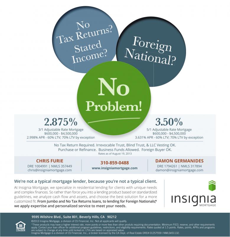 ©2013 Insignia Mortgage, a division of CS Financial, Inc. Not all applicants will qualify. *These products may have ahigher interest rate, more points or more fees than other produts requiring documentation. Minimum FICO, reserve, and other requirements apply. Contact your loan officer for additional program guidelines, restrictions, and eligibility requirements. Rates quoted at 1.5 points. Rates, points, APRs and programs are subject to change at any time until locked-in. LTVs are based on appraised value. Insignia Mortgage is a division of CS Financial, Inc., a broker licensed by the CA Dept. of Real Estate DRE# 01257559 | NMLS#31132.