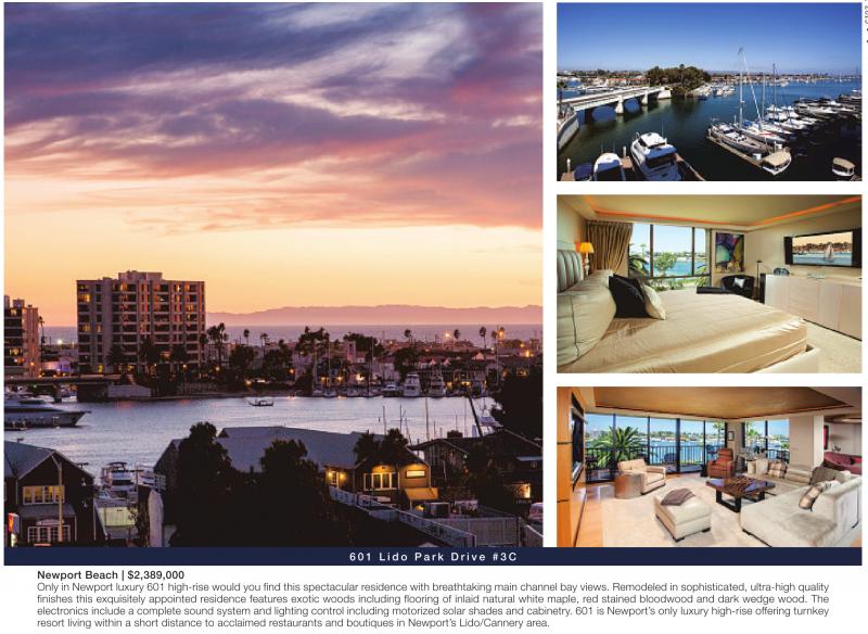 601 Lido Park Drive #3C Newport Beach | $2,389,000 Only in Newport luxury 601 high-rise would you find this spectacular residence with breathtaking main channel bay views. Remodeled in sophisticated, ultra-high quality finishes this exquisitely appointed residence features exotic woods including flooring of inlaid natural white maple, red stained bloodwood and dark wedge wood. The electronics include a complete sound system and lighting control including motorized solar shades and cabinetry. 601 is Newport’s only luxury high-rise offering turnkey resort living within a short distance to acclaimed restaurants and boutiques in Newport’s Lido/Cannery area.