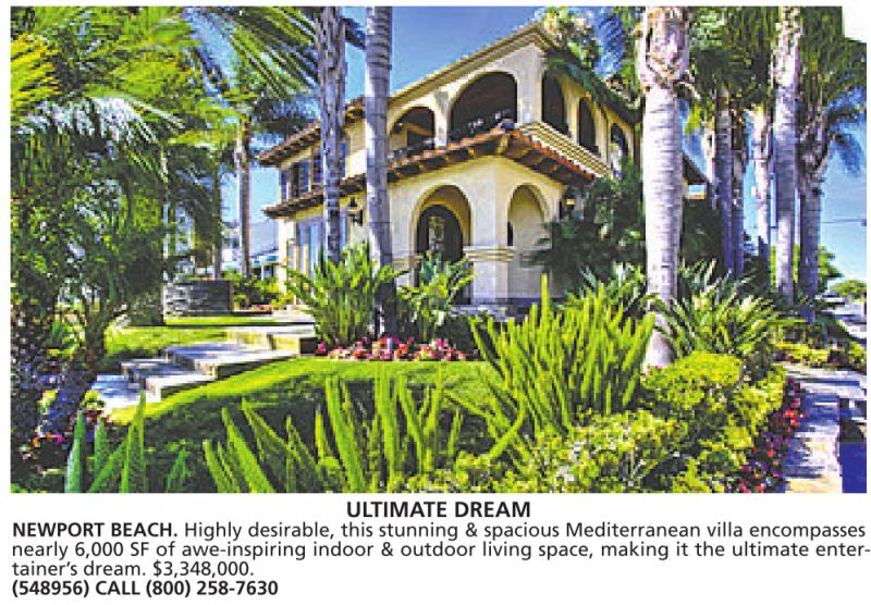 ULTIMATE DREAM NEWPORT BEACH. Highly desirable, this stunning & spacious Mediterranean villa encompasses nearly 6,000 SF of awe-inspiring indoor & outdoor living space, making it the ultimate entertainer’s dream. $3,348,000. (548956) CALL (800) 258-7630