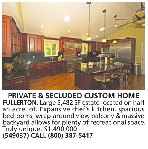 PRIVATE & SECLUDED CUSTOM HOME FULLERTON. Large 3,482 SF estate located on half an acre lot. Expansive chef’s kitchen, spacious bedrooms, wrap-around view balcony &massive backyard allows forplenty of recreational space. Truly unique. $1,490,000. (549037) CALL (800) 387-5417