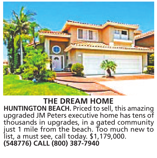 THE DREAM HOME HUNTINGTON BEACH. Priced to sell, this amazing upgraded JM Peters executive home has tens of thousands in upgrades, in a gated community just 1 mile from the beach. Too much new to list, a must see, call today. $1,179,000. (548776) CALL (800) 387-7940