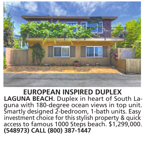 EUROPEAN INSPIRED DUPLEX LAGUNA BEACH. Duplex in heart of South Laguna with 180-degree ocean views in top unit. Smartly designed 2-bedroom, 1-bath units. Easy investment choice for this stylish property &quick access to famous 1000 Steps beach. $1,299,000. (548973) CALL (800) 387-1447