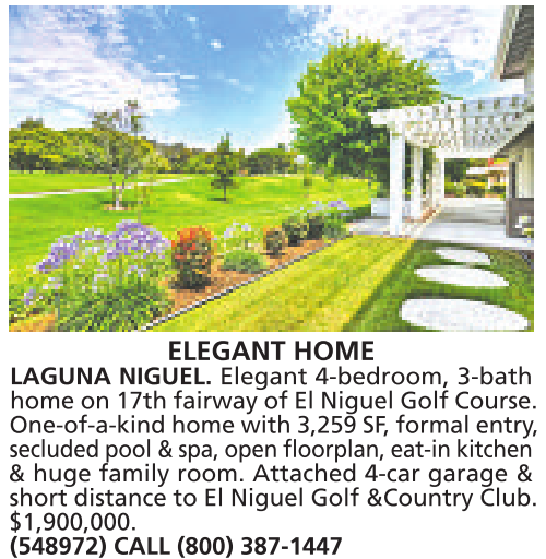ELEGANT HOME LAGUNA NIGUEL. Elegant 4-bedroom, 3-bath home on 17th fairway of El Niguel Golf Course. One-of-a-kind home with 3,259 SF,formal entry, secluded pool &spa, open floorplan, eat-in kitchen & huge family room. Attached 4-car garage & short distance to El Niguel Golf &Country Club. $1,900,000. (548972) CALL (800) 387-1447
