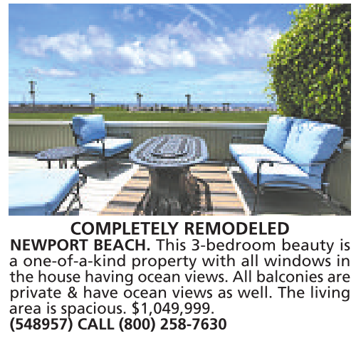 COMPLETELY REMODELED NEWPORT BEACH. This 3-bedroom beauty is a one-of-a-kind property with all windows in the house having ocean views. All balconies are private & have ocean views as well. The living area is spacious. $1,049,999. (548957) CALL (800) 258-7630