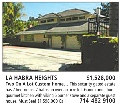 has7bedrooms,7bathsonoveranacrelot.Gameroom,huge gourmet kitchen withviking6burner stove andaseparateguest house.MustSee! $1,598.000 Call 714-482-9100