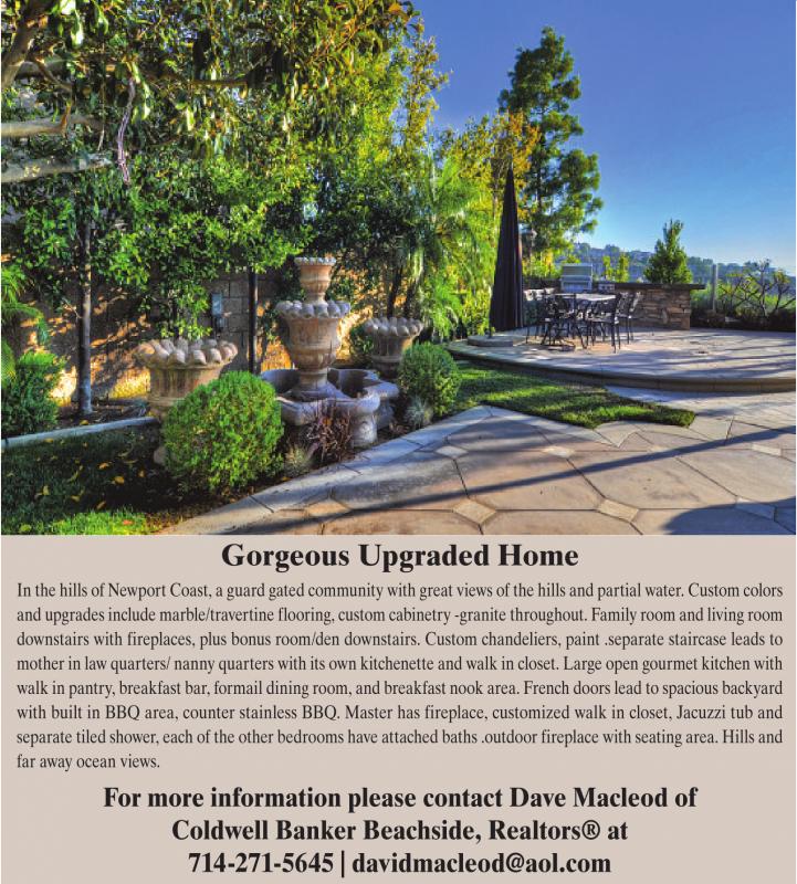 Gorgeous Upgraded Home In the hills of Newport Coast, a guard gated community with great views of the hills and partial water. Custom colors and upgrades include marble/travertine flooring, custom cabinetry -granite throughout. Family room and living room downstairs with fireplaces, plus bonus room/den downstairs. Custom chandeliers, paint .separate staircase leads to mother in law quarters/ nanny quarters with its own kitchenette and walk in closet. Large open gourmet kitchen with walk in pantry, breakfast bar, formail dining room, and breakfast nook area. French doors lead to spacious backyard with built in BBQ area, counter stainless BBQ. Master has fireplace, customized walk in closet, Jacuzzi tub and separate tiled shower, each of the other bedrooms have attached baths .outdoor fireplace with seating area. Hills and far away ocean views. For more information please contact Dave Macleod of Coldwell Banker Beachside, Realtors® at 714-271-5645 | davidmacleod@aol.com