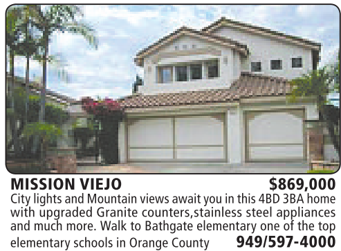 MISSION VIEJO $869,000 City lights andMountain viewsawaityou in this 4BD3BA home with upgraded Granite counters,stainless steel appliances and much more. Walk to Bathgate elementary one of the top elementary schools in Orange County 949/597-4000