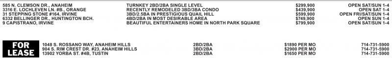 585 N. CLEMSON DR., ANAHEIM TURNKEY 2BD/2BA SINGLE LEVEL $299,900 OPEN SAT/SUN 1-4 3316 E. LOCHLEVEN LN. #B., ORANGE RECENTLY REMODELED 3BD/3BA CONDO $439,900 OPEN SAT 1-4 31 STEPPING STONE #164, IRVINE 3BD/2.5BA IN PRESTIGIOUS QUAIL HILL $599,900 OPEN FRI/SAT/SUN 1-4 6332 BELLINGER DR., HUNTINGTON BCH. 4BD/2BA IN MOST DESIRABLE AREA $749,900 OPEN SUN 1-4 9 CAPISTRANO, IRVINE BEAUTIFUL ENTERTAINERS HOME IN NORTH PARK SQUARE $799,900 OPEN SAT/SUN 1-4