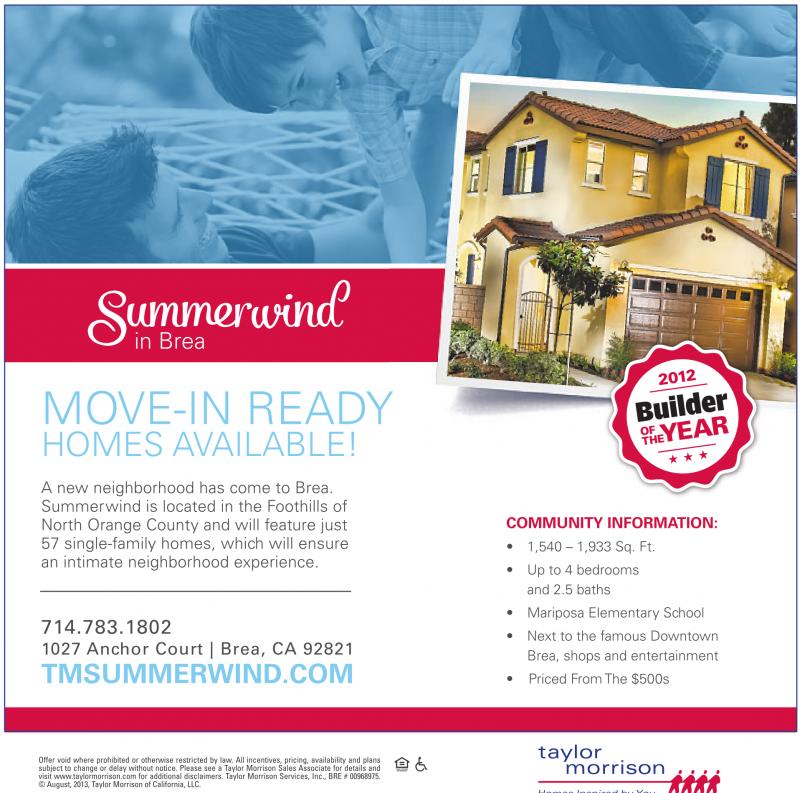 in Brea MOVE-IN READY HOMES AVAILABLE! A new neighborhood has come to Brea. Summerwind is located in the Foothills of North Orange County and will feature just 57 single-family homes, which will ensure an intimate neighborhood experience. 714.783.1802 1027 Anchor Court | Brea, CA 92821 TMSUMMERWIND.COM Offer void where prohibited or otherwise restricted by law. All incentives, pricing, availability and plans subject to change or delay without notice. Please see aTaylor Morrison Sales Associate for details and visit www.taylormorrison.com for additional disclaimers. Taylor Morrison Services, Inc., BRE #00968975. ©August, 2013, Taylor Morrison of California, LLC. COMMUNITY INFORMATION: • 1,540 – 1,933 Sq. Ft. • Up to 4 bedrooms and 2.5 baths • Mariposa Elementary School • Next to the famous Downtown Brea, shops and entertainment • Priced From The $500s