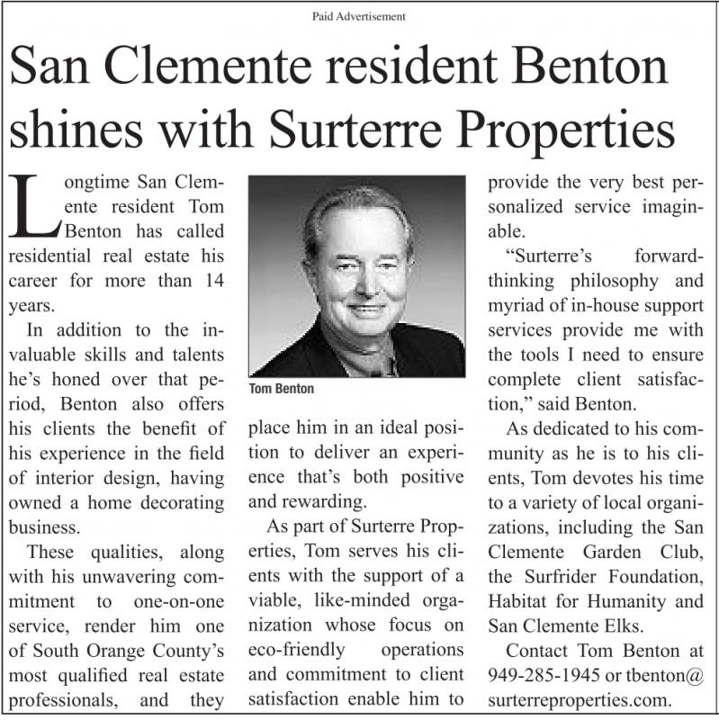 Longtime San Clemente resident Tom Benton has called residential real estate his career for more than 14 years. In addition to the invaluable skills and talents he’s honed over that period, Benton also offers his clients the benefit of his experience in the field of interior design, having owned a home decorating business. These qualities, along with his unwavering commitment to one-on-one service, render him one of South Orange County’s most qualified real estate professionals, and they place him in an ideal position to deliver an experience that’s both positive and rewarding. As part of Surterre Properties, Tom serves his clients with the support of a viable, like-minded organization whose focus on eco-friendly operations and commitment to client satisfaction enable him to Paid Advertisement San Clemente resident Benton shines with Surterre Properties TomBenton provide the very best personalized service imaginable. “Surterre’s forwardthinking philosophy and myriad of in-house support services provide me with the tools I need to ensure complete client satisfaction,” said Benton. As dedicated to his community as he is to his clients, Tom devotes his time to a variety of local organizations, including the San Clemente Garden Club, the Surfrider Foundation, Habitat for Humanity and San Clemente Elks. Contact Tom Benton at 949-285-1945 or tbenton@ surterreproperties.com.