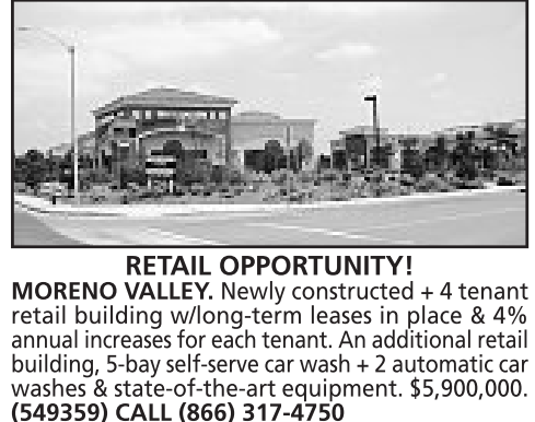 RETAIL OPPORTUNITY! MORENO VALLEY. Newly constructed +4tenant retail building w/long-term leases in place & 4% annual increases for each tenant. An additional retail building, 5-bay self-serve car wash +2automatic car washes &state-of-the-art equipment. $5,900,000. (549359) CALL (866) 317-4750